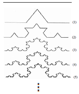 Estos conjuntos que se logran por transformaciones mediante un proceso iterativo llevado al infinito crean una estructura fractal,9 es decir, conjuntos que poseen autosimilitud a una escala menor y una dimensión no entera. Lo que evidencia algunos principios del pensamiento complejo (Morin, Ciurana, Mota, 2002); el principio de recursividad (la acción de iterar), el principio dialógico, lógicas que se complementan y se excluyen -la fractalidad es una forma de evidenciar el caos (diálogo entre orden y desorden)-, y el principio hologramático (el todo está en la parte que está en el todo, o simplemente, autosimilitud a escala).