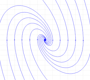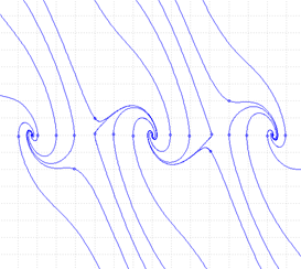 Nótese la gran diferencia entre los retratos de fases. En la figura 10 resaltan más de un punto de equilibrio, esto se debe a la periodicidad de la función seno, caso contrario al de la figura 11, ya que con la linealización del sistema se pierde dicha periodicidad, resultando solo un punto de equilibrio.