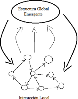 La visión de Chris Langton (Lewin, 1992, p. 27) acerca de las emergencias es una interacción de los resultados globales no previstos a nivel local pero que influyen en la interacción local; en otras palabras, “la idea establece que las características del todo no pueden deducirse a partir de las características de las partes” (Reynoso, 2006, p. 26). De igual forma, enfatiza que las totalidades complejas se originan en principios y elementos muy simples, esto es, gráficamente: