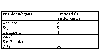 Se trabajó con 36 personas pertenecientes a diferentes pueblos indígenas del Caribe colombiano con los que hasta el momento se han podido analizar los dos contextos mencionados: arhuaco, kogui, kankuamo, wayú y ette ennaka. Las entrevistas se llevaron a cabo en espacios de trabajo, contextos de estudio y visitas a casas, buscando tener un acercamiento más estrecho al uso que se le daba a una lengua indígena en un contexto y al español en otros.