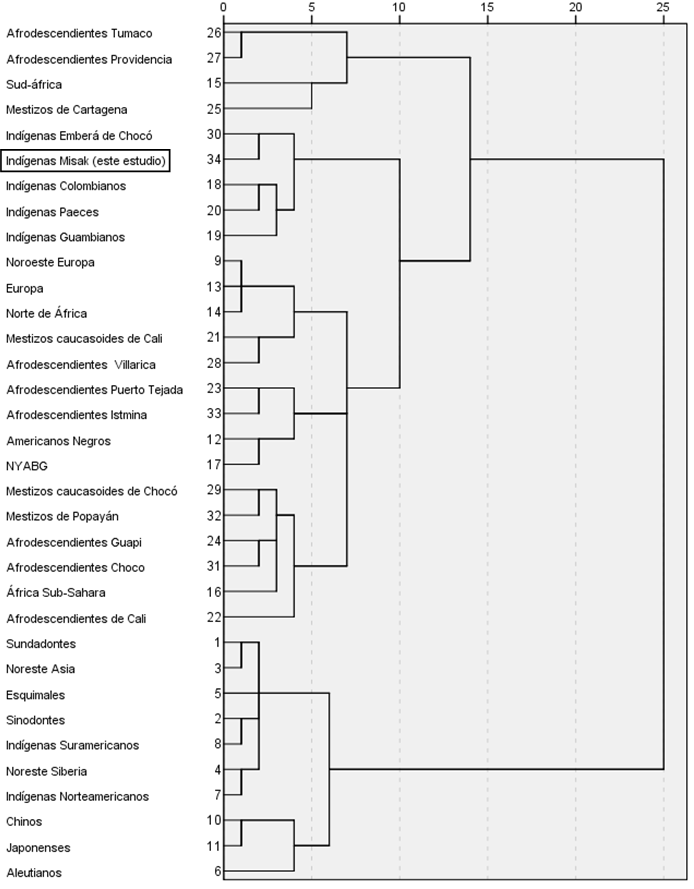 El dendograma permitió observar que la muestra de indígenas misak de este estudio se agrupó con otras poblaciones indígenas colombianas en un mismo conglomerado, y se aproximó a dos conglomerados constituidos por poblaciones mestizas caucasoides y afrodescendientes con las que comparte el mismo territorio geográfico y con las que se ha mezclado, como consecuencia de diferentes procesos etnohistóricos ocurridos durante los últimos 500 años (Figura 1).