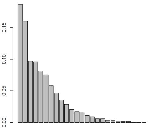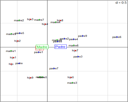 Finalmente, se correlacionó la expresión de los 14 RMDC entre padres e hijos para estimar el modo de herencia a través de un análisis de correspondencia múltiple en el Software R (Project for Statistical Computing), en el que se categorizó la dicotomía presencia/ausencia de cada rasgo morfológico, para identificar inicialmente la inercia de las variables observadas respecto a cada uno de los ejes de análisis, donde los primeros cinco valores propios estuvieron determinados de la siguiente manera: 0,1865, 0,1602, 0,09657, 0,09553 y 0,0814. Para que el análisis fuera posible, se escogieron los dos primeros ejes factoriales, los cuales recogieron el 34,6 % de la variabilidad, con un 18,65 % para el primero y un 16,02 % para el segundo. De esta forma, se tomaron a los hijos, madres y padres para ser ubicados en los puntos dentro de las dos dimensiones seleccionadas y poder identificar los cuadrantes en donde los tres miembros de la familia presentaron la mayor tendencia.