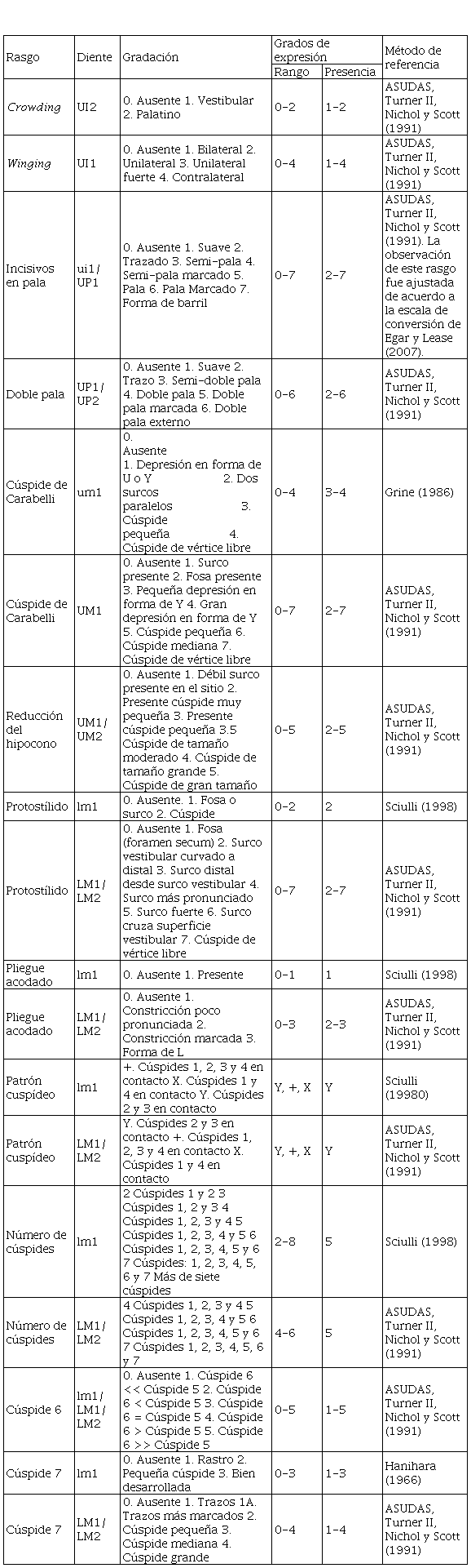 Posteriormente, se tomaron 60 impresiones (30 superiores y 30 inferiores) de los arcos dentales, con alginato Tropicalgin® Zhermack®, a través de cubetas plásticas tipo Coe®, para obtener los modelos de estudio en yeso tipo III comercial americano. Además, se realizó la observación de los RMDC tenidos en cuenta en este estudio a través de diferentes sistemas de registro de acuerdo a la dentición decidua Arizona State University Dental Anthropology System —ASUDAS— para cúspide 6 (Turner II, Nichol y Scott, 1991); Grine (1986), para cúspide de Carabelli; Sciulli (1998), para protostílido, pliegue acodado, patrón cuspídeo y número de cúspides; Hanihara (1966), para cúspide 7; y, de acuerdo a la dentición permanente, ASUDAS para los 14 RMDC (Turner II, Nichol y Scott, 1991) (Tabla 1).