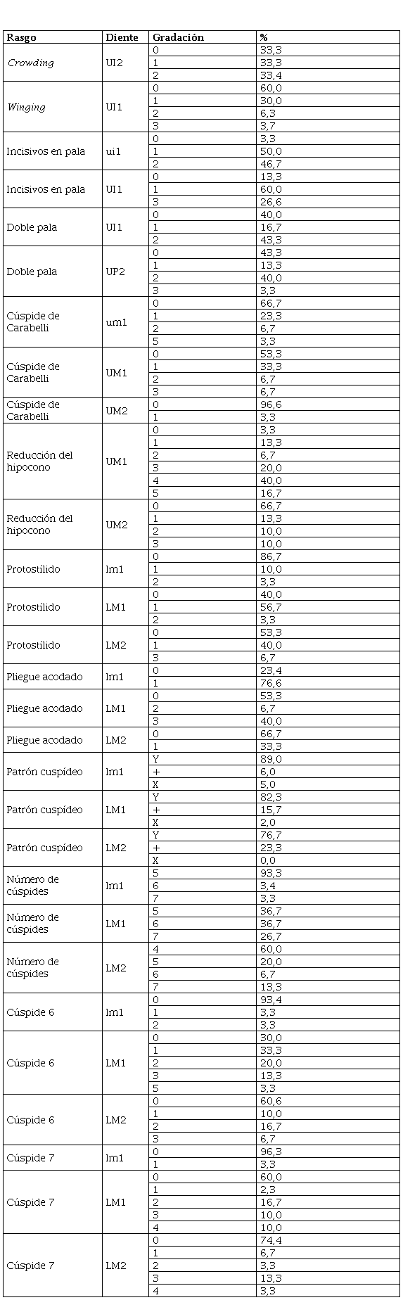 De acuerdo con la dicotomía presencia/ausencia, la frecuencia y la variabilidad de los RMDC (Tabla 2) en la dentición decidua fue alta para la forma medianamente marcada de pala de incisivos laterales (96,7 %), alta para el punto P del protostílido (98,0 %), para el pliegue acodado (76,6 %), para el patrón cuspídeo en Y (89,0 %), para el número de 5 cúspides (93,3 %) y para expresiones de cúspide 6 de pequeño tamaño (70,7 %); y fue baja para cúspide de Carabelli (3,3 %), expresión cuspídea del protostílido (3,3 %) y para la cúspide 7 (3,3 %). En el caso de la dentición permanente, fue alta para crowding (66,7 %), para winging (40,0 %), para la forma medianamente marcada de pala de incisivos centrales (60 %), para la ausencia de reducción de hipocono (83,4 %), para el punto P del protostílido en primeros molares (90,0 %) y segundos molares (92,0 %), para el patrón cuspídeo en Y de los primeros (89 %) y de los segundos molares (76,7 %), y para expresiones de cúspide 6 de pequeño tamaño en los primeros molares (66,7 %). También fue alta para la forma medianamente marcada de doble pala de incisivos centrales (43,3 %) e incisivos laterales (43,3 %), para el pliegue acodado en primeros molares (46,7 %), para el número de 5 cúspides (36,7 %) y para expresiones de cúspide 6 de pequeño tamaño en los segundos molares (39,4 %); y baja para la cúspide de Carabelli en primeros (13,4 %) y segundos molares (totalmente ausente 0 %), para las expresiones cuspídeas del protostílido en primeros (3,3 %) y segundos molares (6,7 %), para el pliegue acodado en segundos molares (33,3 %), para el número de 5 cúspides (20,0 %) y para la cúspide 7 de primeros (37,7 %) y segundos molares (19,9 %).