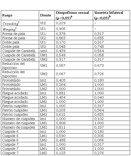 En términos generales, no hubo dimorfismo sexual con la excepción de la cúspide 6 de los segundos molares permanentes, en donde se observó una mayor expresión en las mujeres, asociada a la distribución de la muestra por sexo. Asimismo, se observó simetría bilateral en la expresión y la variabilidad de los RMDC (Tabla 3).