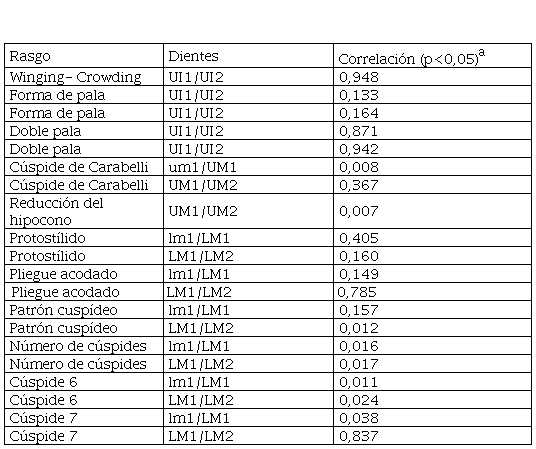 Respecto a la correspondencia entre la expresión y la variabilidad de un mismo RMDC en dos tipos de dientes de una misma clase de toda la muestra, se encontró que hubo correlación para las expresiones en fosa de la cúspide Carabelli entre molares temporales y permanentes y entre molares permanentes, considerada prácticamente ausente del total de la muestra. También se encontró correlación para la ausencia de reducción del hipocono en los primeros y segundos molares permanentes, para la tendencia a configurar cinco cúspides en los molares temporales y permanentes, para la cúspide 6 entre los molares deciduos y permanentes y entre los primeros y segundos molares permanentes, y para la ausencia de la cúspide 7 entre molares temporales y permanentes. Para el resto de RMDC no hubo correlación asociada a la gran variabilidad de los grados de expresión que condiciona la dicotomía presencia/ausencia (Tabla 4).