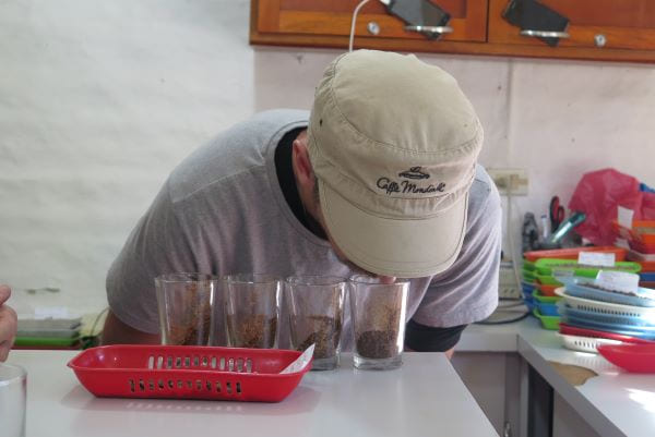 Para estos talleres, el ingeniero y su ayudante usaban diferentes recursos pedagógicos. Durante toda la jornada se realizaron dos actividades paralelas. Mientras el ingeniero Nelson orientaba la discusión, Daniel, el barman, estaba realizando diferentes preparaciones de café, clasificándolas de acuerdo con las particularidades de cada producto, entre cafés de variedades y orígenes locales, en diferentes tostiones y preparaciones. Las bebidas eran degustadas por todos y cada uno iba atribuyendo diferentes características que se referían al sabor y al olor de las bebidas. Las descripciones más comunes fueron dulce, ácido y agrio. Menos frecuentes fueron las denominaciones a caramelo, miel de abejas, cacao, dulce de leche, frutos rojos, maní y avena, entendidos los dos últimos como defectos y el resto como cualidades. Fue muy interesante que todos verbalizaban sus sensaciones; en algunos casos fue más fluido que en otros, pues encontrar la palabra justa para esas experiencias sensoriales fue inicialmente ocupado por gestos inquietantes. Lo interesante de este ejercicio fue que los productores se acercaron a su propio producto desde la valoración como bebida, algo innovador hasta el momento: una aproximación que ellos no estaban acostumbrados a tener. Degustar el café que ellos producen los llevó a valorar su trabajo desde otro conocimiento, a entender las catalogaciones del mercado global del producto que ellos desarrollan.