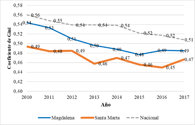 De acuerdo con el coeficiente de GINI, Colombia registró en 2017 uno de los niveles más altos de desigualdad de América Latina, existiendo alta concentración del ingreso (0.517), con el agravante que, a nivel local, en Santa Marta, creció dicha problemática pasando de 0,450 en 2016 a 0,467.