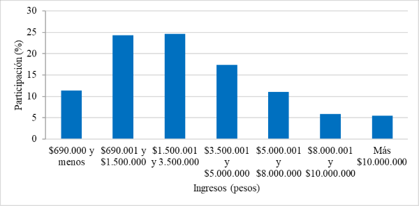 El 11,4% de la muestra pertenece a núcleos familiares que viven con menos de un salario mínimo mensual, en palabras de Sen (2000), este grupo carece de suficientes recursos económicos para satisfacer sus necesidades básicas, lo que hace que tengan menores oportunidades y libertades para ascender en la escala social, este sentido, se esperaría que este grupo tenga el mayor número de personas encuestadas apoyando las medidas de redistribución de la riqueza. El 66% de la muestra se encuentra en hogares que tienen ingresos mensuales que oscilan entre $690.000 y $5,000.000, mientras que el 11% de los encuestados viven en hogares con ingresos entre $5,000.000 y $8,000.000. En contraste el 11,4% de los estudiantes encuestados viven en familias que tienen los mayores ingresos, que son iguales o superiores a $8.000.000 de pesos (Figura 3).