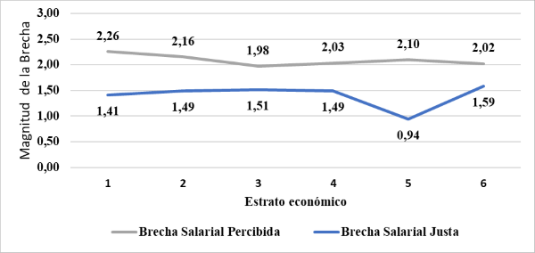 Con el análisis de las brechas salariales percibida y justa, se pudo identificar las opiniones respecto a la justicia de salarios entre las personas con mayor y menor cualificación. A través de los datos hallados se infiere que los estudiantes encuestados de Santa Marta tienden a aumentar los salarios tanto percibidos como ideales, es decir promueven la igualdad de la sociedad mediante menores diferencias entre los salarios (Figura 4). De acuerdo con la figura 4 la brecha salarial se acentúa cuando se analiza la brecha salarial percibida.