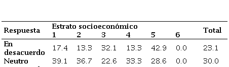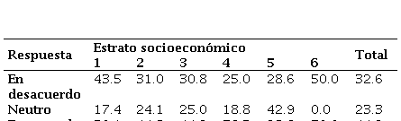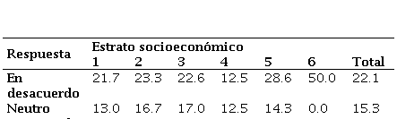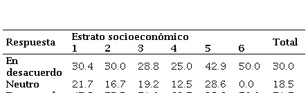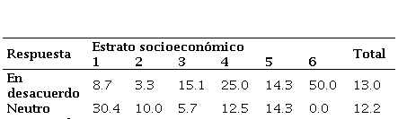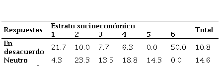 Es decir, las personas encuestadas con más recursos consideran correcto dar responsabilidad al individuo y no al sistema. En el estrato socioeconómico 5, se observa un alto porcentaje (43%) en neutro, lo cual no permitió encontrar datos relevantes para la discusión (Tabla 5).