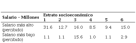 Cuando se analiza por estrato, se evidencia una tendencia de que los estudiantes encuestados en estratos económicos bajos tienden a aumentar los salarios tanto percibidos como ideales. De igual forma se evidencia que los encuestados dan mayor importancia al salario percibido más alto en comparación al salario ideal y que a la vez, dan mayor importancia al salario ideal bajo en comparación al salario percibido bajo. Los encuestados muestran una característica de igualar la sociedad mediante las brechas salariales entre salarios altos y bajos (tabla 11).