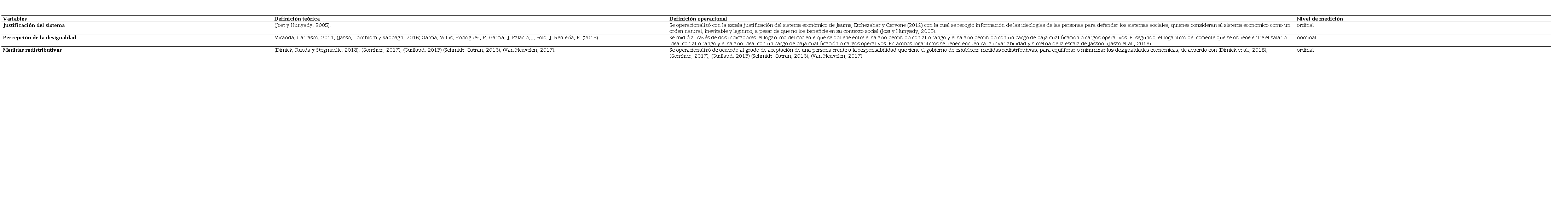 Se escogieron tres variables cualitativas ordinales: Justificación del sistema, percepción de la desigualdad y medidas redistributivas. De esta manera, de acuerdo con cada objetivo específico, se analizó una variable. A continuación, se define y describe la operacionalización de las variables estudiadas.