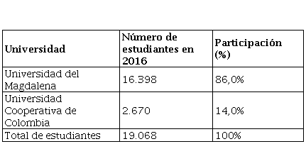 El universo poblacional se compone de la suma de estudiantes de la Universidad del Magdalena (16.398) y de la Universidad Cooperativa de Colombia (2670), que en total suman 19.068. Teniendo en cuenta el tamaño de cada población estudiantil de estas universidades, la muestra se extrajo de manera proporcional a estas, de la siguiente manera (tabla 1):