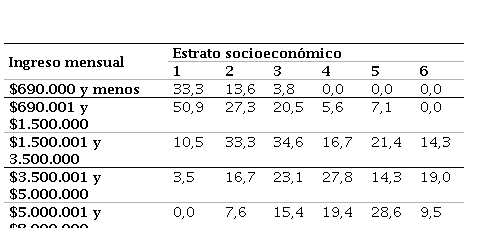 Como se observa en la tabla 3, no siempre las familias de los encuestados de estratos socioeconómico más bajos tuvieron los menores ingresos. Este hecho podría explicarse por diversas razones, como la decisión en estos sectores para pagar menores tarifas de servicios públicos o impuesto predial. De otra parte, se encontró que no todos los encuestados de estratos más altos se ubicaron en el rango de mayores ingresos. Ello podría explicarse por la situación laboral de los integrantes de la familia o porque viven en una casa heredada.
