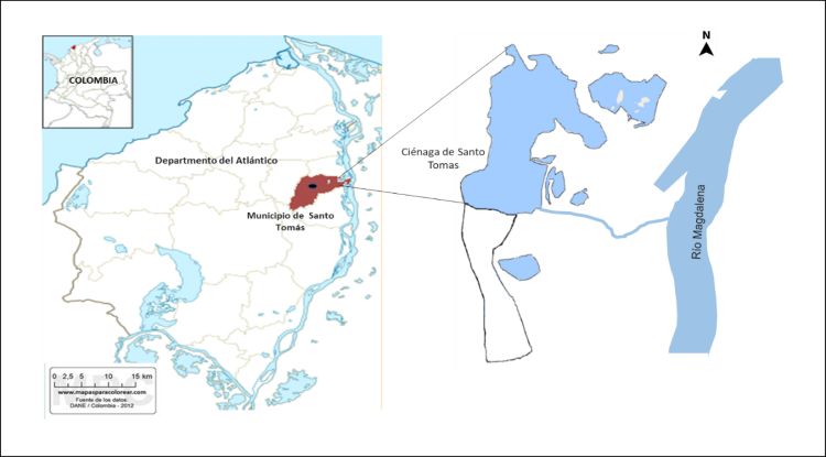 El municipio de Santo Tomás, departamento del Atlántico, tiene una extensión de 62 km. y una población de 28.693 habitantes (Departamento Administrativo Nacional de Estadística [DANE], 2018). Se encuentra a 8 metros sobre el nivel del mar, su territorio ligeramente ondulado es plano hacia el oriente y tiene áreas cenagosas en cercanías al río Magdalena, entre las que se destaca la ciénaga de su mismo nombre, situada entre los 10 ° 76 'N y 74 ° 55' y está conectada con el río por un canal de 2,12 km de largo (Ilustración 1); su extensión es de 105 hectáreas y se considera un humedal natural pequeño en comparación con otros de mayor tamaño en el departamento, como la Ciénaga El Totumo, que tiene 2.100 hectáreas o la Ciénaga Mallorquín, de 1.250 hectáreas (Corporación Autónoma Regional del Atlántico [CRA], 2004).