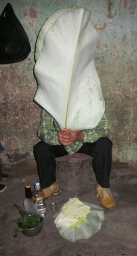 El jaibaná, vestido con un pantalón negro de lino bien planchado, camisa verde de cuadros y zapatos que parecen nuevos, está sentado en un tronco sobre el que pone una cobija que dobla para que le sirva de cojín. Canta al tiempo que con sus manos sujeta por el tallo dos hojas de bihao (Heliconia bihai) que mantiene en posición vertical, una tras la otra, mostrando la parte blanca de su reverso. Con esas hojas se oculta del pecho hacia arriba y se queda quieto, sin una cara visible, piernas separadas, rodillas ligeramente elevadas y antebrazos que descansan sobre sus muslos (ver fotografía 1).
