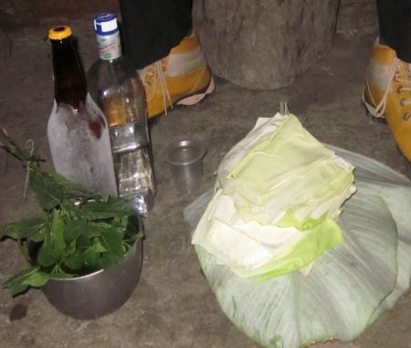 Y ya ponía ya toda la mesa. Ya ponía que unos copitos (copas con licor) por debajo de… de las hojas. ¡Verdad!, lo hacían de todo. Maíz cocinado, hacían jugo… lo dejaban fuerte… por allá, lo iban tapando. Y así tenía que estar en la mesa donde ya va trabajar el médico tradicional. Y él ahí ya sentado. (conversación personal, 2019)