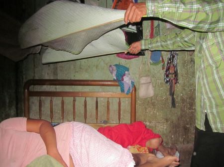 La joven mujer que el jaibaná está curando y su esposo están sentados en una de las dos camas de una habitación que tiene las paredes despintadas y raspadas en las que se alcanza a percibir un tono verde aguamarina. También está presente la esposa del jaibaná. En el lugar hay dos niños pequeños, los hijos menores de cada matrimonio y ahijados de ambas parejas, quienes duermen después de llorar por unos minutos. El jaibaná y su compadre trabajan recogiendo café en las fincas cercanas. Los constantes bostezos muestran su cansancio, pues salieron de trabajar apenas hoy en la tarde. La mujer que va a ser curada y su esposo duermen por ratos. Ambos están acostados a lo ancho de la cama, sobre el lado derecho del cuerpo, dando la espalda a la cabecera, con sus caras vueltas hacia al etnógrafo. A sus pies descalzos, “para defenderlos”, está el jaibaná (ver fotografía 3).