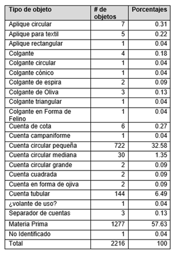 Durante el desarrollo de la investigación se tuvo acceso al material excavado en los proyectos de YUMA y Montes de María. Gracias a estos dos se pudo ver la producción durante los siglos XIII-XVI d.C. de objetos en Plato, Magdalena, y el uso contemporáneo de estos por parte de las comunidades que vivían en la serranía de San Jacinto y las llanuras del Caribe. El análisis morfológico y tecnológico de los objetos encontrados en los talleres de Plato permitió identificar la elaboración de 20 tipos diferentes de ornamentos, entre los que se encuentran 8 tipos de cuentas, 3 tipos de apliques, 7 tipos de colgantes, 1 tipo de separador de cuentas y 1 tipo de herramienta que era un volante de uso (Márquez-Prieto, 2022). En otras colecciones como las del Museo del Oro, Museo de Galapa, Museo comunitario de San Jacinto, Mapuka y Museo Manuel Huertas Vergara, se pudieron identificar además “agujas”, narigueras, instrumentos musicales, colgantes en forma de animales como aves, platirrinos, armadillos, ranas, humano-ave, garras y dientes de jaguar, vestimentas como cubresexos y hebillas para el cabello, y objetos únicos como remates de bastón, darienes, un “hombre-langosta” y un colgante o pectoral que pertenece a una colección privada (Márquez-Prieto, 2021).