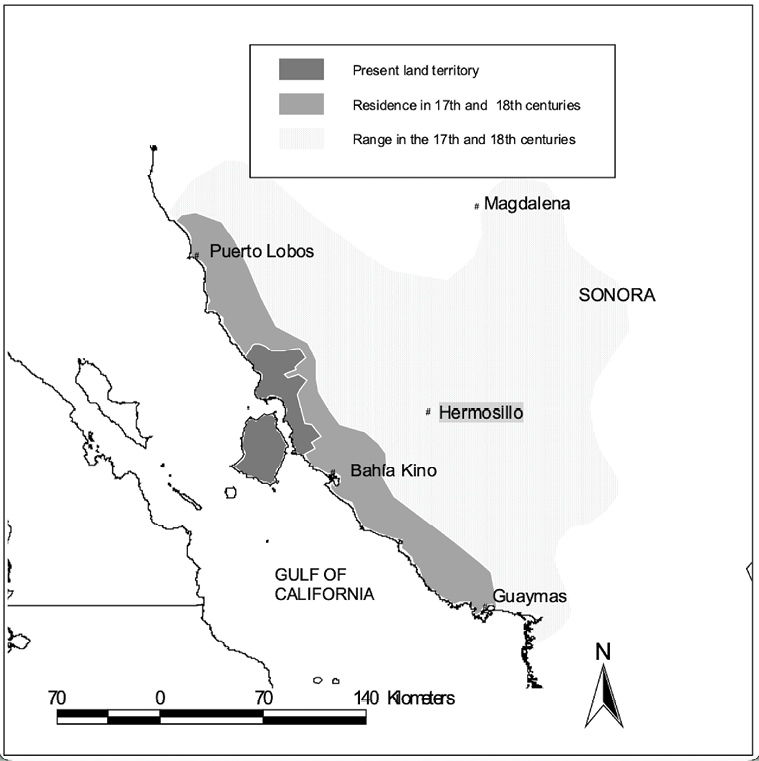 Esta es una historia tejida en varios tiempos, que hila diferentes tipos de relatos, unos ancestrales, otros contemporáneos, multivocales, de seres de diferentes naturalezas, los relatos son la descripción de los hechos y los relatos cruzados son el tejido de reflexiones que se dan en torno a los relatos. De esta manera, se van develando y entretejiendo interacciones en Hant comcaac, (territorio comcaac) o «Serilandia», como algunas personas de la comunidad y de afuera, le dicen al territorio en el cual los comcaac o seris nómadas caminaban hasta hace aproximadamente 70 años (ver mapa 1, color gris claro) y que hoy se ha reducido a lo que el Gobierno de México les asignó mediante la Resolución presidencial, formando el ejido de Desemboque y su anexo Punta Chueca (ver mapa 1 color negro). El Canal del Infiernillo, que se forma entre el continente y la Isla Tiburón, con gran riqueza pesquera fue decretado de uso exclusivo de la comunidad y su cooperativa pesquera. La Isla Tiburón también fue restituida como «propiedad en bienes comunales», con 120 000 has. (D.O.F. 11/02/1975) (Luque y Robles, 2006, p. 173).