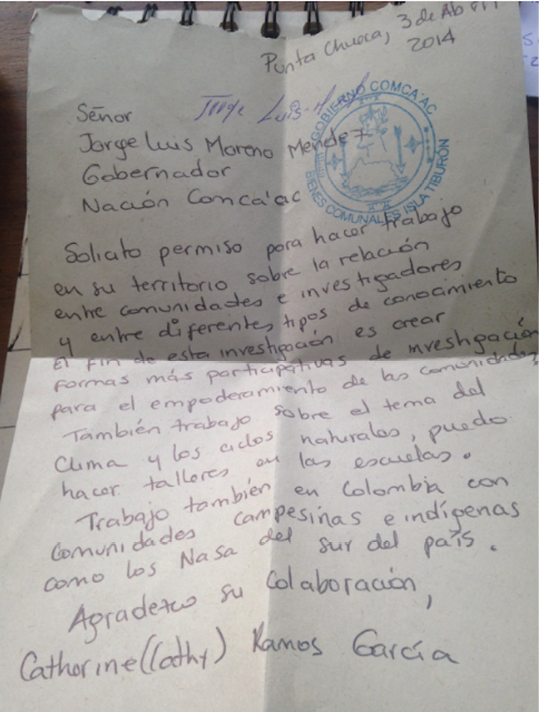 Al llegar a Punta Chueca, a solicitar el permiso al gobierno tradicional comcaac para realizar la tesis en su territorio, el gobernador salió de una reunión del comité técnico para la cacería a atenderme. Le conté el tema de mi investigación; me dijo, sonriendo, «¿Vas a investigar a los investigadores?», «sí», le contesté. Me pidió hacer un documento a mano contando el tema de la tesis y dejarle una copia, mientras tanto entró de nuevo a la reunión, les comentó en su lengua que yo iba a investigar a los investigadores (Romy, quien me acompañaba, me tradujo), hubo una carcajada general… El gobernador salió diciéndome: «nos alegra mucho que alguien, al fin, investigue a los investigadores y puso el sellito de la gobernación autorizando la investigación (Foto 1)».