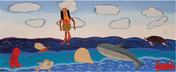 Las tortugas tienen un lugar muy especial en la ontología (González y Carro, 2016) comcaac. Hablamos de ontología, como la manera de estar en el mundo, de sentirlo, vivirlo, más allá de sólo «verlo» (cosmovisión) y conocerlo (epistemología). En la historia de origen, fue una tortuga quien ayudó a Hant Caai a traer los granitos de arena (ver Ilustración 1) para poder crear la tierra; cuentan algunas versiones que fue una tortuga prieta (Chelonia mydas) y en otras, una siete filos (Dermochelys coriacea). Hant Caai le habla a todos los animales del mar para pedirles que le traigan del fondo del mar arena para poder crear la tierra, los otros animales fracasan en su intento, la tortuga es la única que logra el cometido.