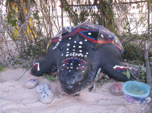 Yo quedé tan impactado por el tamaño del animal y por cómo se le canta y cómo se le habla, porque Cleotilde Morales le cantó y le habló a la manera tradicional de nosotros, yo quería como repetir eso que vivimos allá. Hace 30, 40 años que no sucedía por acá, recordé la forma y el tamaño, yo quería hacer una réplica de una tortuga que habíamos visto allá, ya que tenía la forma en la mente, los colores, hice un esqueleto de alambre con alambre de diferentes grosores, hice la cabeza, el cuerpo, las aletas y ya que estaba terminado el esqueleto, lo recubrí con papel periódico como si fuera una piñata, yo nunca había trabajado ni con alambre, ni con piñatas de ningún tipo ni nada, pero era muy natural todo, como si ya supiera cómo la iba a hacer, después de eso la forma quedó de papel, su boca, su cabeza, sus brazos, toda la forma quedó terminada y la cubrí con fibra de vidrio por fuera, con resina y fibra de vidrio para que fuera un poco más sólida aunque fuera hueca en el interior. Ya que estaba terminada la fibra de vidrio, la pintamos del color de una tortuga real, rosa, negro por arriba, con manchas blancas y manchas negras y ya que quedó terminada la llevé a Punta Chueca, ninguno, teníamos plan, ni dinero, pero se le hizo una pequeña ceremonia, y mucha gente ayudó (A. Mellado, comunicación personal, mayo de 2017).