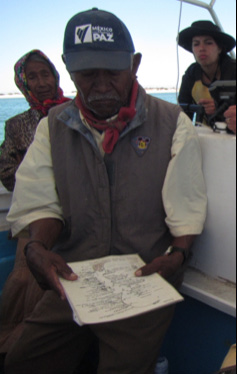 Meses después estuvimos involucrados en un proyecto para capacitar jóvenes Seri como paraecólogos, en donde se impartía conocimiento combinado, el tradicional por parte del Consejo de Ancianos y el tradicional occidental por investigadores que daban información científica sobre el tema. Fueron varios temas los que se enseñaron, aves, tortugas, pastos marinos, geografía, mapas de ubicación espacial, entre otros. Durante la salida de campo a ver tortugas marinas, íbamos tres embarcaciones llenas de alumnos seris y de profesores, en un punto en medio del Canal de Infiernillo nos paramos, José Juan dice que ahí es donde se ven tortugas marinas y antes las cazaban, dice que las va a llamar. Algunos de los jóvenes se burlan de él, «pobre viejo loco», pero comienza a cantarles a las tortugas, todos o la gran mayoría incrédulos. José Juan canta, y un par de minutos después salen tres tortugas prietas junto a las embarcaciones y nadan en círculos a nuestro alrededor, todos callados, tenemos la piel de gallina de la emoción (Torre y Bourillon, 2011).