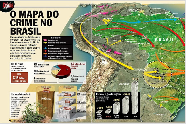 Para combater as facções que brotaram nos presídios de São Paulo e nos morros do Rio de Janeiro, é preciso entender a sua dimensão. Esses grupos se movem dentro de uma estrutura gigantesca, cujo principal combustível é o tráfico de cocaína (O MAPA..., 2007, p. 57).