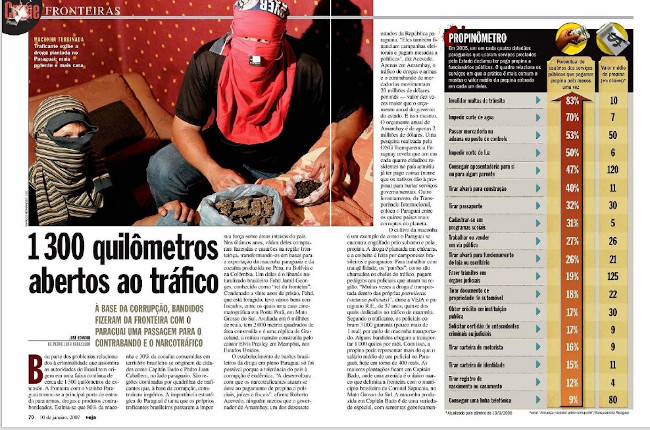 A reportagem apresenta a estimativa de que 80% da maconha e 30% da cocaína consumidas no Brasil vêm do Paraguai. Há, em todo o texto, o uso de indicativos para repassar ao leitor uma ideia negativa do país: os criminosos são chamados de “barões da droga”, que lá se estabeleceram graças ao fato de a “tolerância do país à corrupção” ser “endêmica” (p. 70). O Paraguai é citado como um dos 15 países mais corruptos do planeta e que está “engolfado pelo suborno e pela propina” (p. 71).