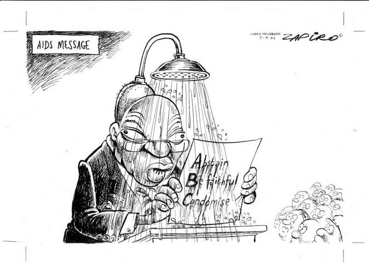 Começou como algo simples durante a primeira acusação de corrupção de Jacob Zuma e ficou muito maior. É claro que continuou e continuou durante o período em que ele foi acusado de estupro. O julgamento aconteceu em 2006 e ele foi absolvido, mas durante o interrogatório ele disse que embora conhecesse a mulher com quem fez sexo, nas palavras dele: sexo consensual. Nas palavras dele, certo? Ele sabia que ela era soropositiva e quando lhe perguntaram no interrogatório “o que você fez depois de fazer sexo", ele disse que havia tomado um banho. Quando lhe questionaram a razão, ele disse que foi para diminuir a chance de uma infecção. Jacob Zuma havia sido o chefe do programa nacional de AIDS quando era vice-presidente, então ele dizer que ele tomou banho para diminuir sua chance de infecção foi ridículo. Por isso, quando ele foi absolvido, eu fiz uma charge onde eu fazia representações físicas de coisas que ele tinha dito, de suas atitudes, e adicionei essas coisas ao seu corpo. Por exemplo, uma metralhadora, da qual ele falou. Eu desenhei essa metralhadora atirando espermatozóides no formato de sua cabeça, uma arma com visor e mira para as saias curtas, porque ele disse que a mulher estava usando uma saia curta insinuante e, para ele, isso queria dizer que ela o estava convidando para fazer sexo. Esse foi o tipo de comentário que ele fez. Então, entre esses outros comentários, entre essas representações físicas, eu coloquei um chuveiro na cabeça dele que dizia “para a prevenção da AIDS” (ZAPIRO, 2018)15.