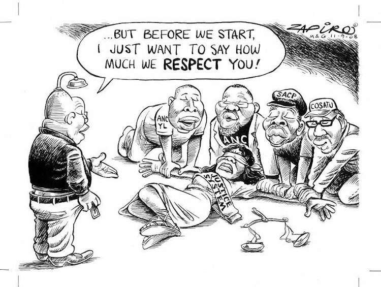 Jacob Zuma era uma pessoa muito menos instruída e que parecia ser um [Thabo] Mbeki negociador, mas havia demostrado ter um péssimo senso de julgamento, moralidade e ética. Tudo isso era de domínio público, era evidente para quem quisesse ver, em 2002. Minha primeira charge sobre a corrupção de Zuma foi em 2002, cinco anos antes mesmo de o CNA nomeá-lo para ser o presidente do partido, mais de sete anos antes dele se tornar presidente do país. Para mim foi uma luta de 15 anos contra Jacob Zuma e uma luta de sete anos contra ele antes que chegasse à presidência (ZAPIRO, 2018)9.
