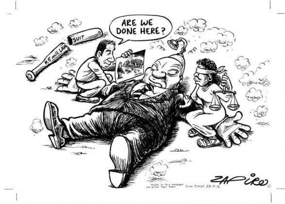 As críticas do CNA não foram suficientes para que o chargista deixasse de explorar intertextualmente a charge The Rape of Justice. Em 2012, quando o então presidente retirou uma das ações que movia na Justiça contra Zapiro, o chargista respondeu com outra charge (figura 08). Zapiro se utilizou, mais uma vez, de seu argumento original, mas, desta vez, Zuma foi a “vítima”. Essa charge pode ser interpretada como um acerto de contas de Zapiro com o presidente.