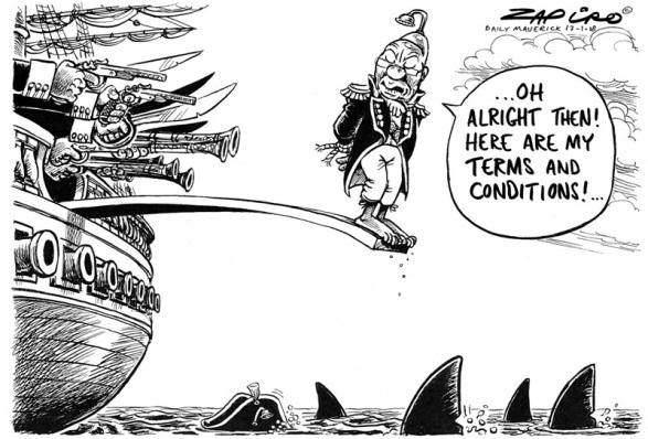 A primeira charge selecionada, intitulada Calling the shots (Chamando os Tiros), remonta ao repertório cultural ao representar o então presidente enquanto um prisioneiro em um navio pirata (figura 01). Zuma está encurralado, na prancha, entre os possíveis tiros que serão disparados pelo inimigo (também há facões!) e os tubarões que estão em volta do navio. A ironia do argumento é estabelecida na fala atribuída ao personagem: “...Oh al right then! Here are my term and conditions!...” (“…Ah tudo bem então! Aqui estão meus termos e condições!...”). O que Zapiro procurou expressar, de maneira irônica, é justamente o contrário, pois Zuma não tinha condições de fazer nenhuma exigência ao CNA, devido ao isolamento político, fruto da instabilidade que ele mesmo havia provocado.