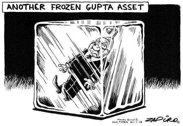 O título da charge Another Frozen Gupta Asset (Outro Ativo Gupta Congelado) é uma ironia do chargista a uma operação iniciada pela Unidade de Confisco de Ativos, com a finalidade de recuperar cerca de 1,6 bilhões de rands desviados, possivelmente em esquemas com a participação dos irmãos. Além de considerar que 17 ações vinculadas à referida operação - que estão sob análise - não representariam o retorno de dinheiro aos cofres públicos, Zapiro aponta também para o congelamento dos fatos ilícitos que supostamente poderiam envolver o ex-presidente. A metáfora utilizada pelo chargista para criticar o “congelamento” das investigações foi mostrar Zuma dentro de um bloco de gelo.