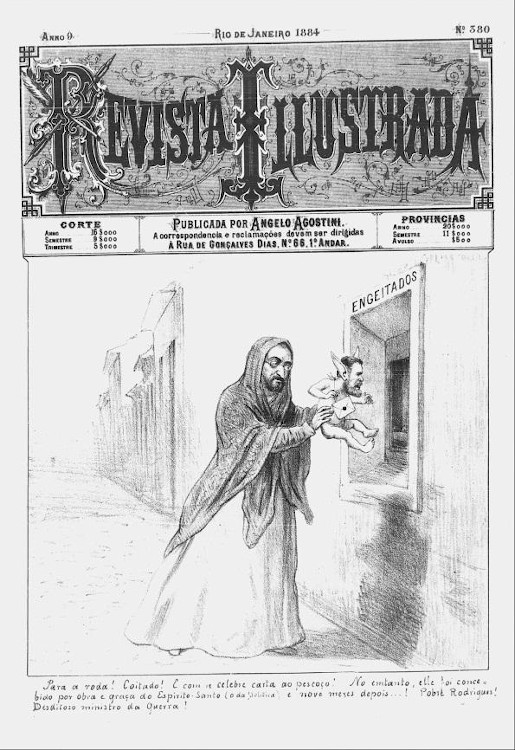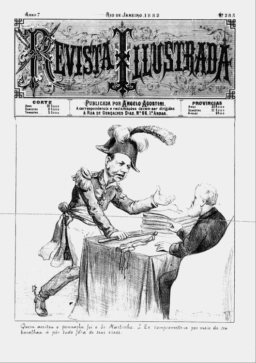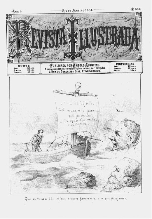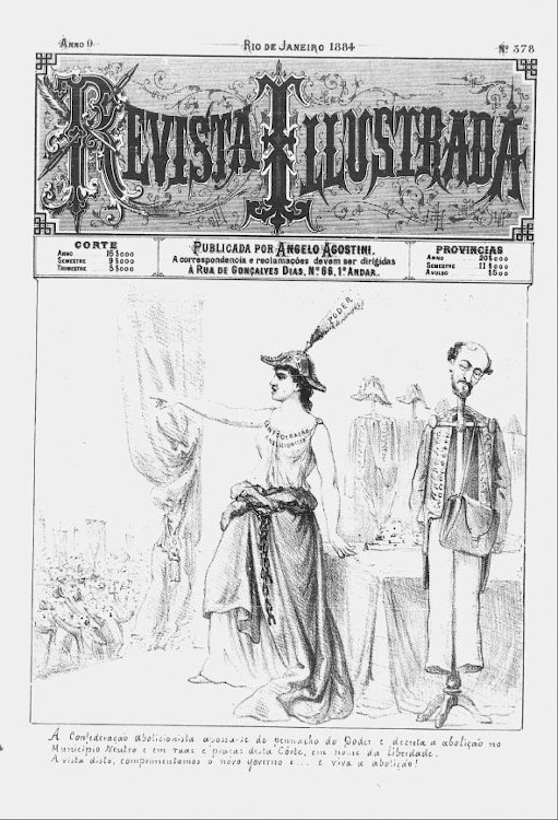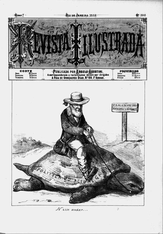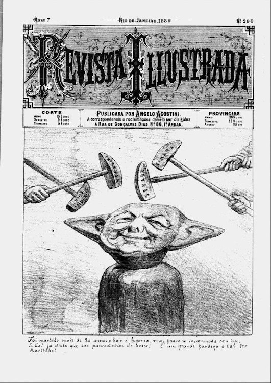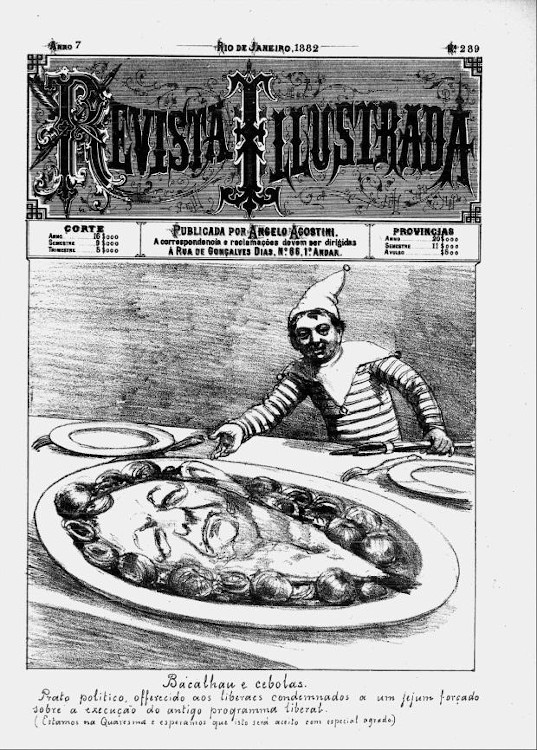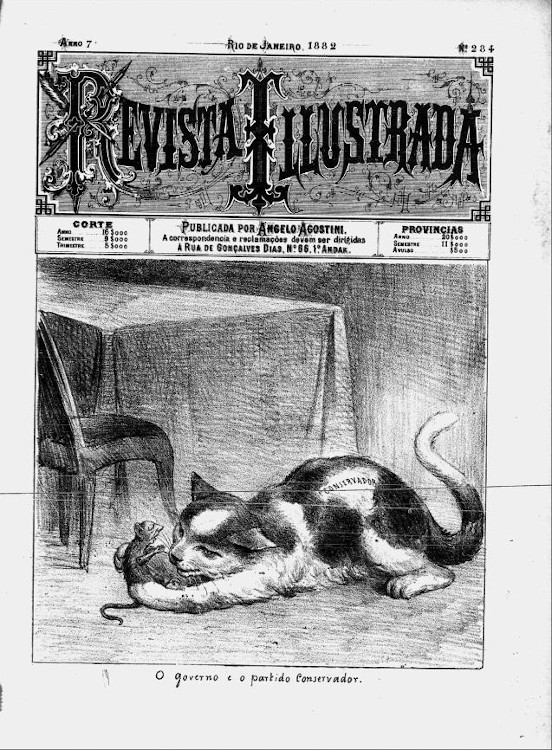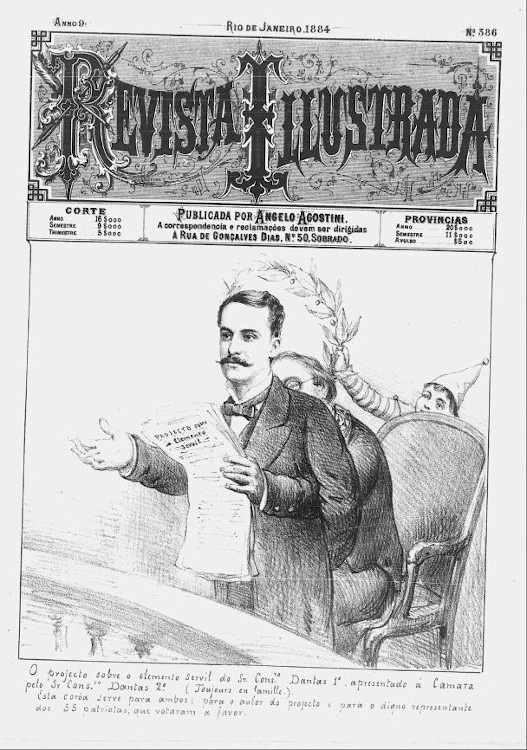 Tal cenário foi acompanhado pela Revista Illustrada, referência obrigatória entre os periódicos que retratavam a sociedade da segunda metade do século XIX. Criada por Ângelo Agostini, em 1876, a Revista Illustrada se distinguiu por associar texto, desenhos e humor na defesa da bandeira abolicionista e por abordar de forma satírica as personalidades públicas e a vida política na Corte. Homens de Estado, deputados, senadores eram notabilizados nas páginas e na capa do periódico como personagens, cujo palco era o Plenário, o Senado, as salas de jantar de medalhões, espaços onde eram tomadas as decisões sobre o dia-a-dia do país.