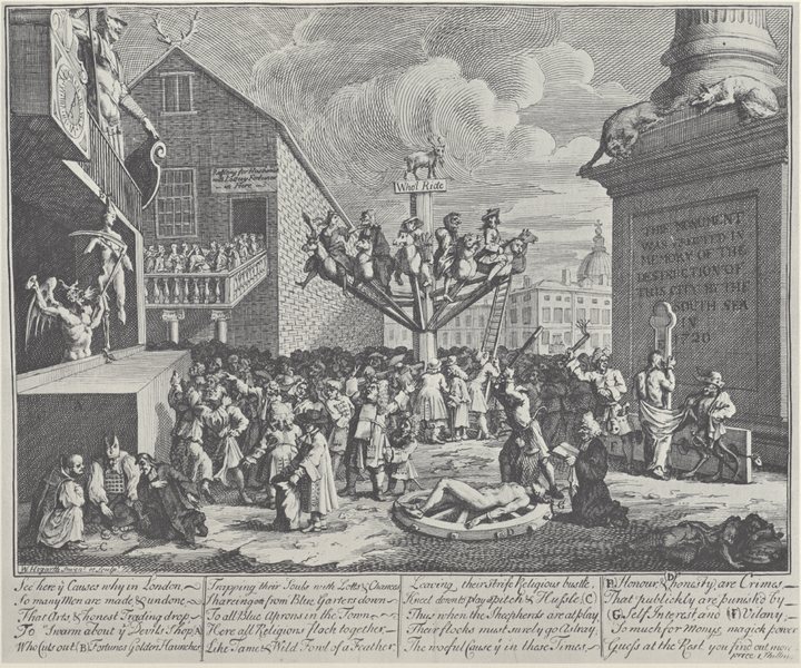 O grupo de apostadores no canto inferior esquerdo da composição simbolizava a natureza da especulação financeira como um jogo de azar, e foram representados por Hogarth como representantes das três religiões dominantes no Ocidente: um judeu, um padre católico e um puritano jogam cartas e ignoram o caos ao seu redor, sugerindo que os religiosos tinham maior preocupação com seus próprios interesses do que com seu rebanho, e ironicamente ao fundo, o artista colocou a Igreja de St. Paul, símbolo da caridade cristã. O Monumento do Grande Incêndio de Londres de 16664 é representado com a seguinte inscrição: “Esse monumento foi erguido em memória da destruição da cidade pelo South Sea em 1720”, com essa perspectiva, o artista comparava o escândalo financeiro a um incidente de ordem natural e com consequências igualmente catastróficas. É interessante notar que ambos os “desastres” foram atribuídos no imaginário, à ambição e ao vício que infestavam Londres, tornando a comparação de Hogarth bastante coerente. No canto, o comércio, representado por uma mulher em trapos e miserável, é mais uma vítima de toda a corrupção e não a sua causa.