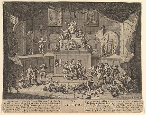 A Loteria, assim como a roda da fortuna, era outro lugar-comum da sátira gráfica: “por anos loterias tinham sido alvo de sátira, pois visavam tanto um estado construído na aposta de dinheiro quanto o desejo geral por dinheiro fácil, o sonho mágico de uma vida transformada” (UGLOW, 1997, p. 89). Quase todo gravador tinha uma gravura com essa temática, assim como no South Sea Bubble que Hogarth tomou um assunto já muito representado, o que resultava numa grande repetição de elementos e uma originalidade mais limitada: “o elenco alegórico divide o espaço com emblemas gastos – roda da fortuna, cata vento, castelos no ar” (UGLOW, 1997, p. 89).