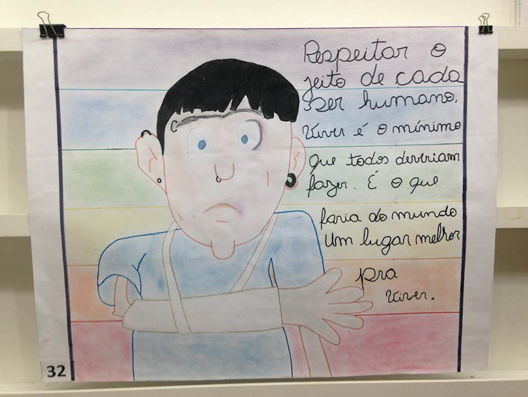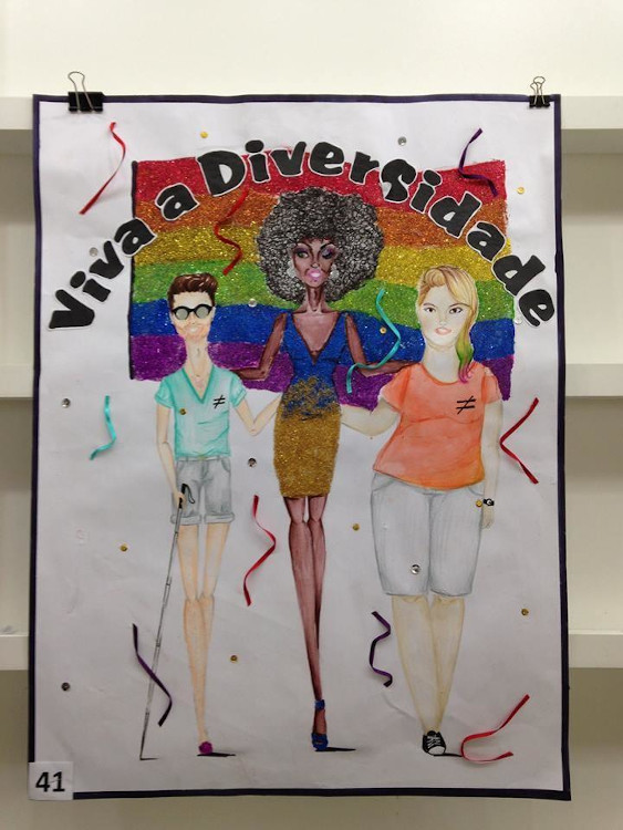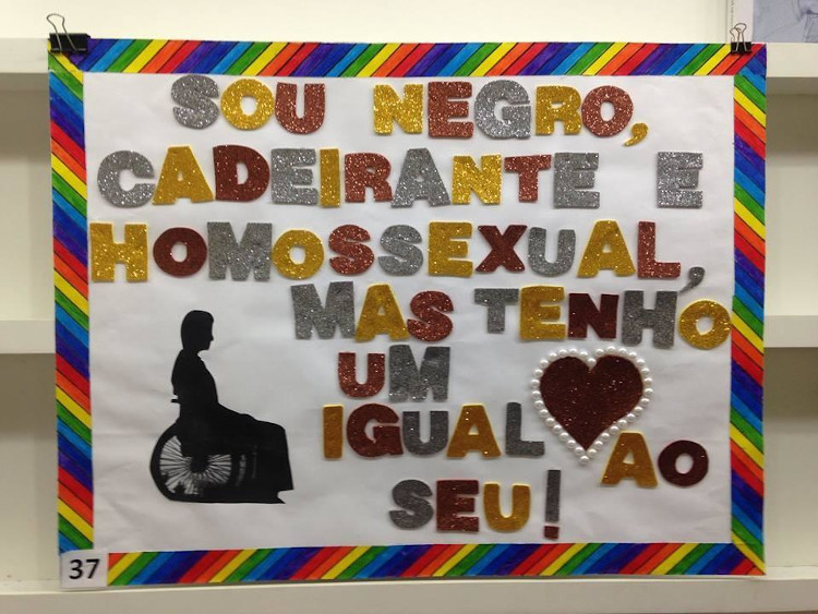Com isso, pretendeu fazê-los voltarem seus olhares para outras formas de preconceito e discriminação, além das citadas anteriormente, tais como: racismo, capacitismo3, xenofobia, preconceitos de classe, de religião, gordofobia, entre outros. As frases de efeito nos cartazes, tais quais: “Sou negro, cadeirante e homossexual, mas tenho um coração igual ao seu!”, “Born this way”, “Viva a Diversidade”, “Favela Gay”, “Ser trans não é um problema para mim, por que deveria ser pra você?”, e “Minha sexualidade não é pro seu prazer” justifica as temáticas debatidas nas oficinas e nas provocações que se instalaram na esfera escolar.