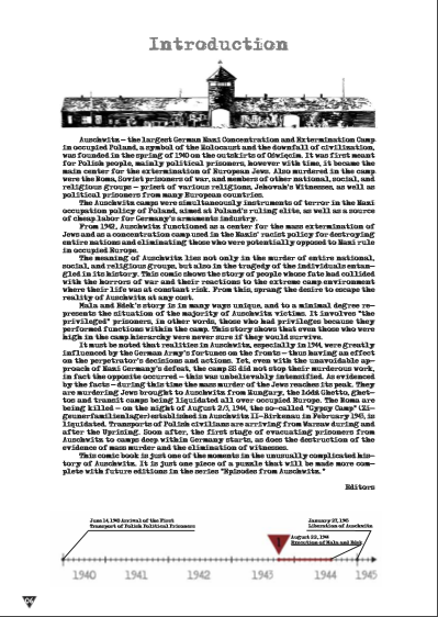 Depois de inúmeras tentativas de apresentar a história do Holocausto em forma de quadrinhos, como por exemplo a obra "Maus", de Spiegelman, é hora de um livro de quadrinhos histórico sobre Auschwitz, em que a história seja apresentada sem distorções ideológicas e estereótipos nocivos. A história é mostrada honestamente e de forma interessante. 90% dos eventos nos quadrinhos são historicamente precisos, com base no testemunho de ex-prisioneiros, 10% dos eventos são historicamente prováveis - situações e eventos, que ocorreram em Auschwitz e foram descritos em memórias, bem como testemunhados por algumas pessoas retratadas nos quadrinhos. Um quadrinho histórico direto, em uma forma gráfica atraente, escrito de forma animada, oferece a oportunidade de perceber melhor os trágicos eventos e, portanto, obter um conhecimento mais direto da história8.