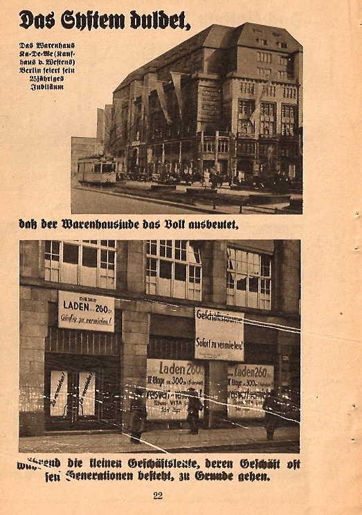 Algumas páginas à frente, vemos acusações aos judeus de serem responsáveis pela exploração do povo e pela quebra dos negócios de pequenos comerciantes durante a crise pós-1929. A página 22 (Fig. 9) faz a contraposição de fotografias de uma grande loja de departamentos, alegadamente propriedade de um judeu, e pequenas lojas de bairro de portas fechadas. Acompanha as fotos, a frase: “O sistema tolera que lojas de departamentos judias explorem o povo, enquanto os pequenos comerciantes, cujos negócios frequentemente duraram gerações, são arruinados.”