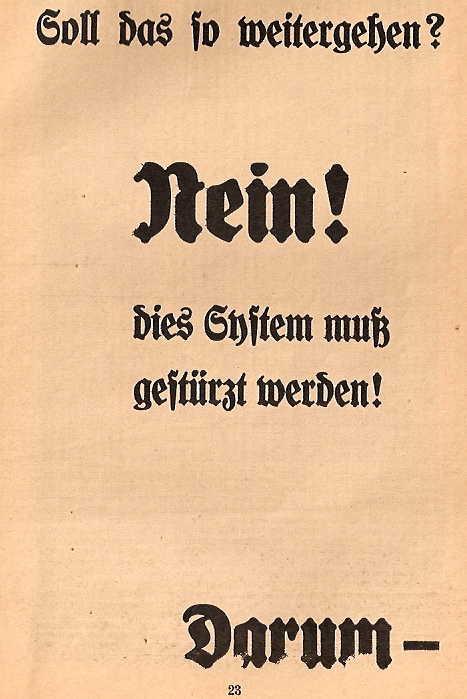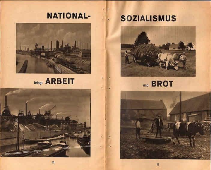A página seguinte (Fig. 10) traz, em caracteres góticos enormes (identificados com a estética tradicional germânica), o texto: “Deve isso continuar? Não! O Sistema deve cair! Portanto”. Vira-se a página, e vê-se uma foto de Hitler, que ocupa mais da metade da página 24 (Fig. 11), a encarar o leitor, com os dizeres: “Dê poder a Hitler”, seguida de imagens “carismáticas” do líder nazista entre o povo. O panfleto encerra-se sob o argumento de que o nacional-socialismo seria o único movimento capaz de solucionar os problemas do “povo alemão” faminto e desempregado no campo e na cidade. Diz: “Nacional-socialismo traz trabalho e pão” (Fig. 12), numa composição visual de palavras e fotos de chaminés industriais combinadas com cenas de trabalho rural.