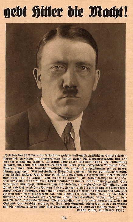 Nas publicações nazistas de 1932, como Fatos e mentiras sobre Hitler (10/04/32) e Derrubem o sistema! (07/1932), por exemplo, aparece um patriotismo conservador de raiz prussiana, que deseja a volta à Alemanha imperial; a solidariedade de Hitler e dos nazistas com as massas miseráveis e desempregadas; e a negação de ser “escravo” das elites e de receber financiamento dos grandes industriais. Diz a brochura Fatos e mentiras sobre Hitler: