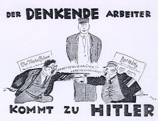 Fato é que os nazistas buscaram tanto provocar como tirar proveito dessa nefasta confusão (decorrente daquela sobre os “verdadeiros socialistas”), como se pode observar numa caricatura publicada no panfleto A maldita suástica: Algo para se pensar, escrito por Goebbels em pessoa, amplamente impresso e divulgado a partir de 1929. Nela, vemos na parte inferior, políticos do KDP e do SPD e seus respectivos jornais – Die Rote Fahne e Vorwärtz – acusando-se mutuamente de “traidores dos trabalhadores”. Um trabalhador de olhar sério que se coloca acima daquele imbróglio ridículo está pronto a escolher seguir com Hitler. Diz o texto: “Trabalhador que pensa vem para Hitler” (Fig. 14).