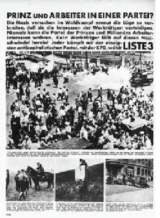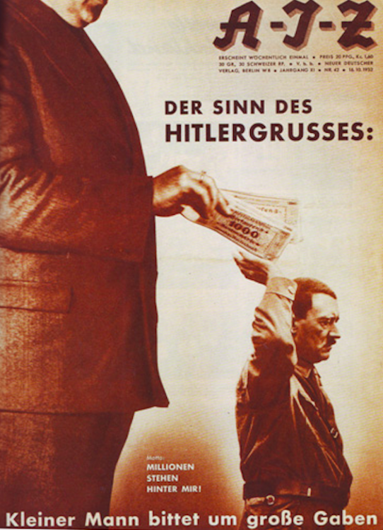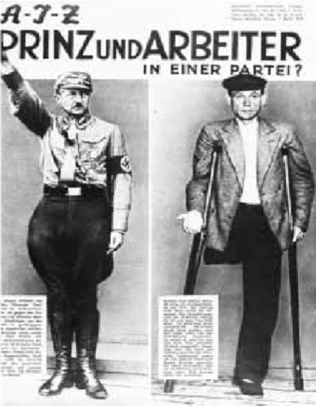 A edição da AIZ de 17 de julho de 1932, cuja capa reproduzia a imagem do príncipe da Prússia e do desempregado de muletas, revela claramente o objetivo de se contrapor a outras revistas ilustradas a partir de um ponto de vista dos trabalhadores. A fotomontagem de Heartfield abordava um tema que era caro aos nazistas: o mascaramento de suas relações com as classes dominantes e a ilusão de que o movimento possuía um caráter socialista. Na realidade, os nazistas haviam reconquistado financiamento direto de grandes industriais desde 193010, quando alcançaram 6 milhões de votos na eleição para o Reichstag. No entanto, negavam enfaticamente tal relação e esforçavam-se em identificar Hitler com os mais pobres e desempregados (ROSENBERG, 2012, p. 185).
