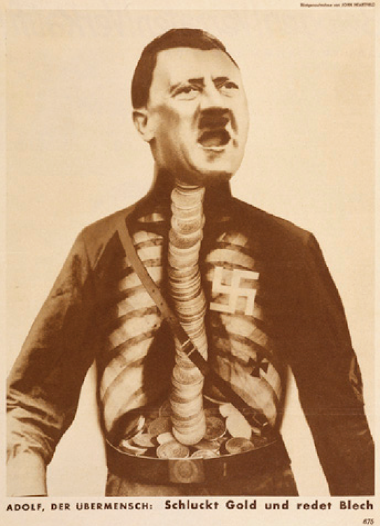 Heartfield parece apontar para o fato de que a mera associação de imagens não levava ao conhecimento da “realidade”; que poderia, pelo contrário, provocar confusão, dado que a fotografia nada mais é que a reprodução de uma aparência da realidade – idêntica, mimética, por vezes informativa, sim; mas não a realidade em si. Essa questão era excepcionalmente relevante pelo fato de que a propaganda nazista se houvera especializado nessas composições de imagens para “narrar” uma versão falseada da história e dos acontecimentos recentes, repletas de apelo emocional e, dentro de sua lógica e forma internas, provocadoras, coerentes e credíveis.