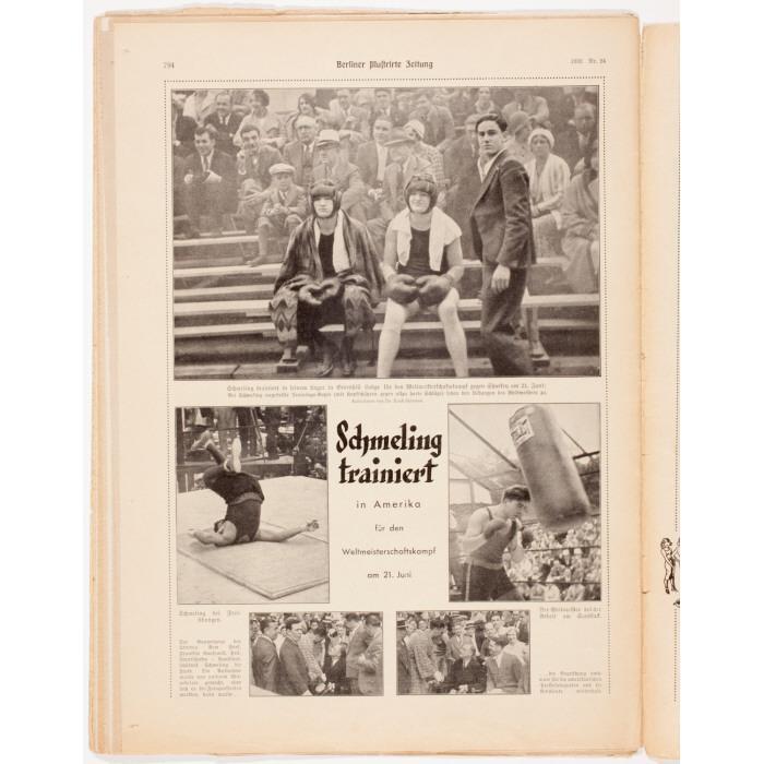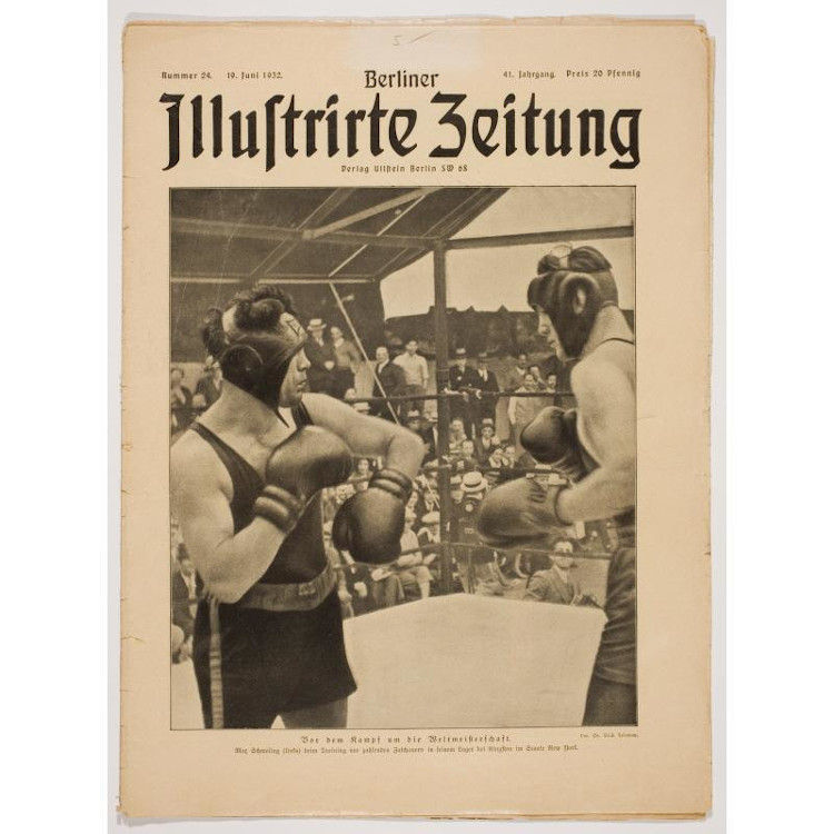 Vejamos, a título de ilustração e comparação, duas publicações contemporâneas. A revista ilustrada semanal mais popular na época, voltada ao entretenimento, era a Berliner Illustrirte Zeitung (BIZ), que chegava à tiragem de 2 milhões de exemplares por semana. Na edição de 19 de junho de 1932, às vésperas das mesmas eleições parlamentares, a BIZ tematizava o famoso lutador de boxe Max Schmeling (1905-2005). Na capa (Fig. 4), vemos a fotografia de uma luta na qual estão os boxeadores no primeiro plano e a plateia ao fundo. Numa das páginas subsequentes (Fig. 5), a revista expõe, em várias fotos, o treinamento do atleta. Buscava explicitar, segundo a prática fotojornalística da época, “todos os ângulos” – de preferência inusitados, “criativos” – do assunto. As revistas anunciavam que o fotojornalismo e a composição das fotografias eram capazes de mostrar “toda a realidade” de tal ou qual acontecimento. E eram, à época, alvos de críticas pela esquerda alemã, como a de Brecht, citada por Walter Benjamin, e dele próprio, em Pequena História da Fotografia (de 1933):
