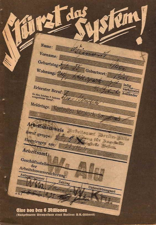 A brochura de 32 páginas traz na capa, junto ao título Derrubem o sistema!, a fotografia do cartão de desempregado de um dos líderes nazistas (Fig. 6). E inicia-se com a identificação do sistema a ser derrubado: a República, proclamada durante a Revolução de novembro de 1918. Fazendo uma espécie de retrospectiva, a publicação, por meio da articulação de imagens fotojornalísticas e pequenos textos, relaciona à República de Weimar todos os problemas sociais – em especial a inflação, a fome e o desemprego –, e a uma suposta “traição” dos “verdadeiros valores germânicos” por comunistas e judeus13.