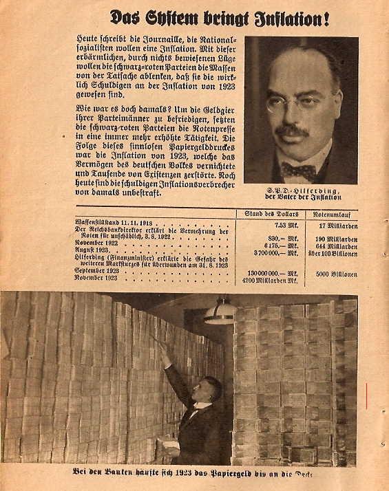 Analisemos nas páginas 10-11 e na sequência 22-24 parte da construção do argumento ao longo das páginas. Chama a atenção, na página 10 (Fig. 7), uma fotografia de dentro de um cofre de um grande banco, com pilhas e mais pilhas de dinheiro. Os nazistas buscavam aqui apresentar sua versão para a enorme inflação que afligia sobretudo a enorme população desempregada. “O sistema causa a inflação!”, diz o título, complementado por uma tabela em que aparecem os números do aumento da inflação na Alemanha desde 1918, explicando-a de maneira convincente, no contexto, porém obviamente simplista (seria causada apenas pela impressão desenfreada de cédulas de dinheiro para alimentar a ambição das elites).